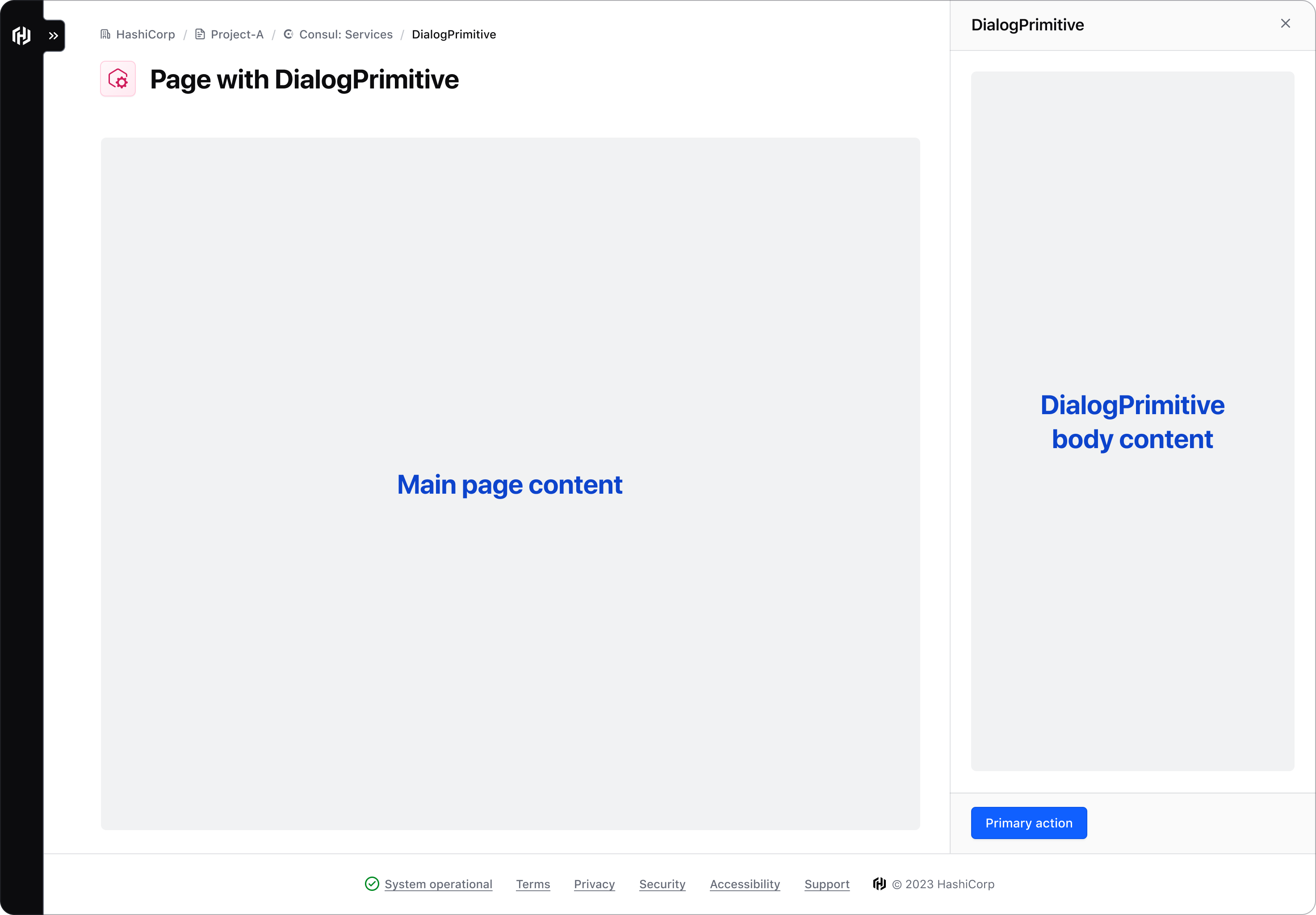 The DialogPrimitive serves as the foundation for dialog derived components like the Modal and Flyout. Unlike other HDS primitives, we recommended using DialogPrimitive components directly when you need to create a dialog with a custom layout. This is particularly useful for constructing non-modal dialogs that integrate into a page layout, rather than floating above it.